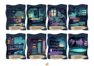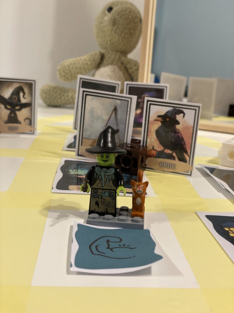- 🧙 Na samym początku postaw swojego czarownika lub czarownicę na skraju dolnego rzędu. Postać wchodzi do domu, a jej celem jest odkrycie, co kryje się w pierwszym pomieszczeniu. Na obrazku możesz wpisać imię swojego bohatera, aby jeszcze bardziej ożywić jego historię!
