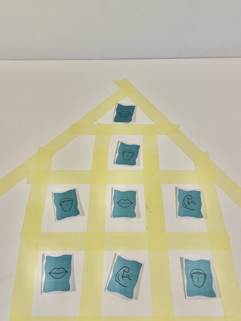 Najpierw stwórz na stole kontur tajemniczego domku za pomocą taśmy malarskiej. 🏠 Domek powinien mieć osiem pomieszczeń. W każdym z nich umieść ilustracje z zadaniami.