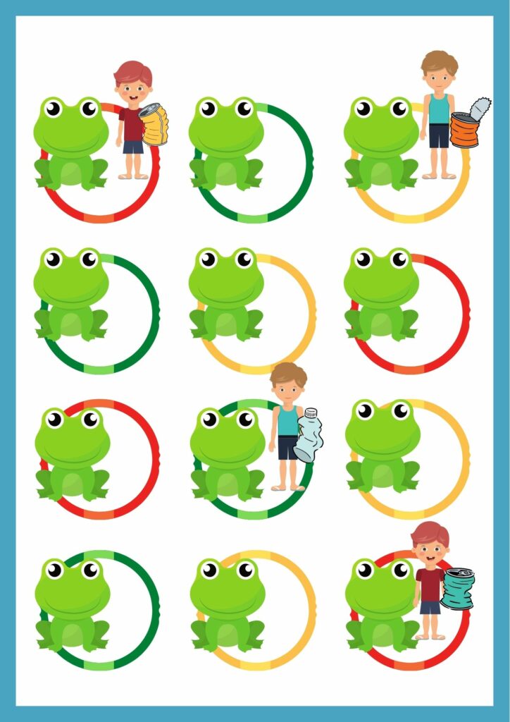 Jak zawsze pomysł świetny, moje żabki wysypywały „śmieci” do koła a dzieci wkładały je do pojemników żaba oddawała pojemnik innemu dziecku i nowa żaba skała dalej
