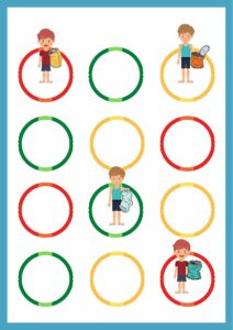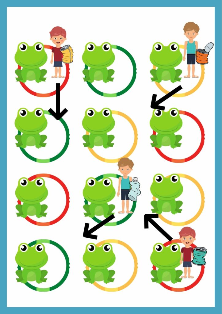 3. Kiedy zabrzmi głośny dźwięk – wszystkie żabki robią skok w miejscu – osoba z emblematem śmiecia natychmiast przemieszcza się do innego koła i staje obok inne żabki.